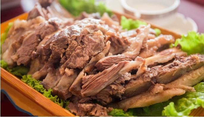 手扒肉是蒙古族招待客人时较为常见的一道特色美食。其做法是将全羊按骨节拆开,这样肉里就不会有骨头渣,然后白水下锅,只放咸盐,不加任何佐料,原汁烹煮,水沸后即出锅,肉味香美,鲜嫩异常。吃时,要用蒙古刀割、刮、剔,再用手扒着吃,故名“手扒肉”。