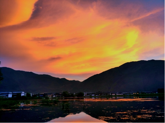 秋景,薄雾中,金黄的稻谷熟了,长满村庄也长满了湿地。白族民居的四周,大山深处,黄灿灿的丰收,抒写了勤劳养育了湖水居住的人民。湖水中悠闲的鱼儿,抚摸倒影的白云,舞蹈自己,为丰收喝彩。一排排整齐排列的村庄,站立,迎接下一个黎明的到来。亲吻着成熟的稻谷,白族汉子终于露出了开心的笑。张开胸怀,把天下的美景拥抱。