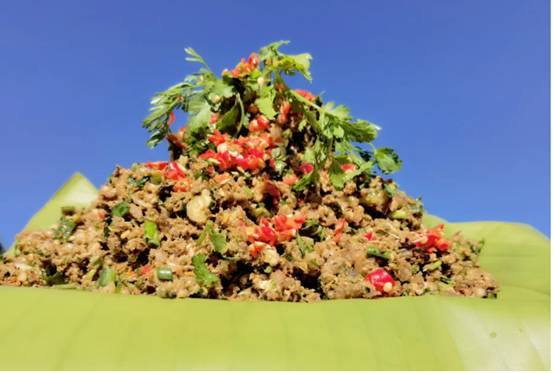 滇橄榄树沿枝干用刀背刮去银白色的外层后,再刮取里面肥厚的树皮。刮下来的树皮会有苦涩味,再用米汤去除苦涩味。之后就用刀剁细,然后再放入烤至八分熟的里脊肉、香料等一起剁。最后放入熟烤烤熟切成薄片的猪皮,再放入火灰煨香煨糊的糊辣椒粉、盐等调料拌匀即可食用。