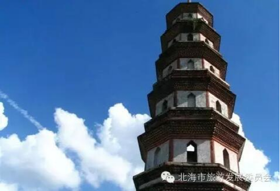 文昌塔一一省级文物保护单位。位于广西合浦县城南郊2.6公里,距北海市区28公里。建于明代万历四十一年(1613),距今三百多年。1981年5月广西区人民政府拨款重修。塔为八角形,高约36米,塔座8.1米,内径2.6米,壁厚2.75米。为7层叠涩密檐砖塔,其造型从底层向上逐层收窄,塔尖冠以葫芦宝顶。每层开着东西通风门,即坤门与凤门,其余是作装饰之用的假门,塔内有阶梯盘旋而上。塔身结构是用青砖摩沿对缝粘砌,表层抹灰浆。塔身的颜色为白色,角边和拱门边为红色,红白鲜明,既朴素又美观。登塔眺望,北海远景尽收眼底。