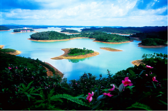 广西北海星岛湖旅游区是利用洪潮江水库发展建成的一个内陆湖旅游度假区,整个水库水面面积6660公顷。湖内的1026个岛屿象星星一样密密麻麻地座落在清澈湛蓝的水面上,星岛湖因此而得名。这里冬暖夏凉,湖面宽阔,湖水清澈湛蓝,光影鉴人,湖深最深达三十二米。岛上林木苍翠、百花争妍,到处是水依岛、山绕水,让你萌生一种“山在水中长,水在林中流”的感觉。这里优雅的环境,清新的空气,茂盛的植被衬托出天水一色的迷人画面,从车水马龙、尘土飞扬的大都市来到这好比仙境的世外桃源,大家的心情一定会很舒畅,会有一种返朴归真、心旷神怡的感想。