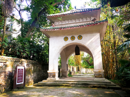 晨钟亭位于中山纪念堂后侧,是1座绿瓦黄柱的亭子,匾题“晨钟”2字。亭中梁上悬挂着南汉乾和十六年(958年)名将(太监)吴怀恩所铸的铜钟1口。钟高1.2米,径0.56米,重250公斤;钟面铸有由十字线隔开的花纹、兽首,并有87字铭文。依据铭文记述分析,钟初铸时,置于梧州云盖山感报寺。后移放光孝寺(大雄寺)冰月阁内,民国20年(1931年)移置北山,并建晨钟亭。虽历千载,但铭文完整无损,击之声音洪亮,是广西现存的两件南汉文物之一。1963年定为自治区级重点保护文物。现晨钟亭内悬挂的铜钟为仿品,南汉铜钟已移至梧州市博物馆收藏。
