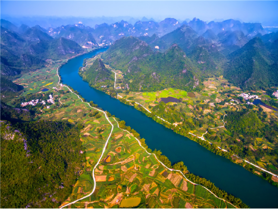 此段红水河可谓是一时一景,一辰一季,一山一水,一草一木皆成格调。云烟里,山点粉黛,水施浅妆,犹如西施抱恙,斜倚阑干,秀发逶迤,放眼处,美人脉脉,云烟成雨;初晴时,碧空如洗,闲云随风,飘飘乎若策马仙人,御气而游,太液池浅,玉碗斜倾。山不据险独占其秀,水不厌深独得其幽,拖曳百里,繁花泻树,炊烟尽头,群芳斗艳,故称之“百里画廊”。