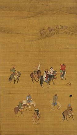 元朝画家刘贯道于至元十七年(1280年)绘制的《元世祖出猎图》,其中骑著黑马、身穿白裘者是元世祖忽必烈。(图片来自故宫博物院官网)