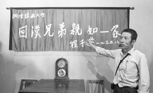 宁夏西吉县兴隆镇单南村党支部书记单云,介绍在单家集陕义堂清真寺的一间房屋内挂着的“回汉兄弟亲如一家”锦匾(复制品)