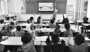 宁夏永宁县原隆村原隆小学老师用电子屏给孩子们上课。 王鹏摄