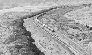一列火车行驶在穿越腾格里沙漠的包兰铁路上。 卢鹰摄