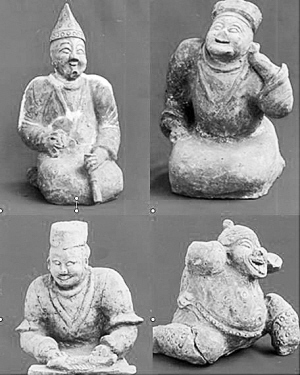 夜郎汉墓出土的造型各异的人俑,依次为胡装说唱俑(左上)、着装说唱俑(右上)、庖厨俑(左下)、赤膊说唱俑(右下)。
