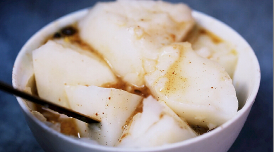 做盐糕,最重要的还是调料:有鲜艳的红辣末,呈泥状的蒜茸,炸花生末,有酸甜可口的卤水,有伴着葱花的蚝油,还有一种是成分不可随便告人的各味兼而有之的糊状调料。
