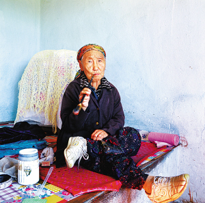 鄂伦春族老阿妈在瓦房内的炕上抽烟袋
