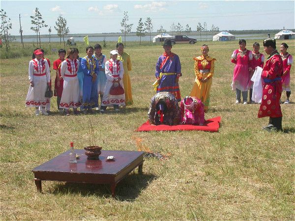 祭火,这是杜尔伯特婚礼祖传的规矩。传说,蒙古部在很早很早以前,被邻部击败后,只剩男女二人,逃入深山老林,为了生存,伐木炽炭,篝火冶铁,繁衍族众。后来,地狭人稠,不得不开路出山,走向草原。后人们为了纪念祖宗篝火冶铁生活,每逢春节或婚嫁,都要拢火祭拜,表示传宗接代。当新郎把新娘接来后,在门前下车(马),由大门到室内白毡铺地,新郎、新娘走白毡,象征着吉祥如意,然后举行祭火仪式。就是在院中心拢一堆火,新郎新娘祭奶酒,嗑头跪拜。同时,由新郎的父母施蒙古礼认亲,最后相互问安。这时赞词人大声颂道: