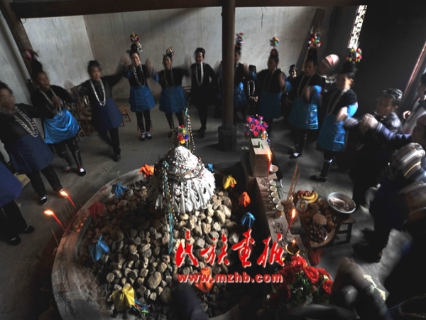 侗族妇女在萨玛寺内围绕着萨玛祭坛进行祭拜