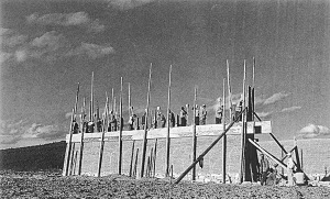 筑墙 在石脚两边竖10根7—8米长的墙杆,把墙板固定在杆内,墙板之间用限量棍顶着,以限制墙的厚度。墙板内一边倒土,一边夯实。筑完一板(亦称一圈)后,墙板上移,固定墙板后再接着倒土夯实。墙要多高,墙板就上移多高即可。墙板上移时,限量棍要逐渐锯短,使墙的厚度呈梯形,增加稳固性。民房墙壁一般筑12板左右,高约6米,寺院中的墙壁则很高,尤其是扎仓(寺院内的主要佛堂和领导机构)的墙,高十几米。筑墙时,一男一女组成一个劳动小组。一般民房,要十几个小组。每组负责约两米宽的墙。男的手握墙棒在墙板内,女的背土往板内倒,倒一篮,夯实一篮。男女的劳动速度,需密切配合,否则就会出现送土快,来不及夯实,影响墙的质量;或是送土慢,造成停工待料,影响整个筑墙进度。因此,在筑墙过程中,需要协调各小组和小组内部的劳动速度。除了要听从筑墙官的调度外,更有效的是,用《筑墙歌》调节送土和夯实的劳动速度。妇女倒一篮土,男子接着边夯边唱。男子在歌声中夯墙,女子在歌声中送土。这种歌与劳动不分家的古老习俗,使劳动场面轰轰烈烈,让人忘记了劳累。筑墙时,不准吹口哨、不能说“倒”字。迪庆高原上,藏民扬麦、青稞时,有边吹口哨边扬的习惯,据说口哨能招来风。所以,筑墙时吹口哨是怕招来大风,而影响墙的质量。筑完墙后,墙头挂上哈达,以示庆贺。主人家除宴请筑墙者外,还要送一份礼物,作为酬谢。