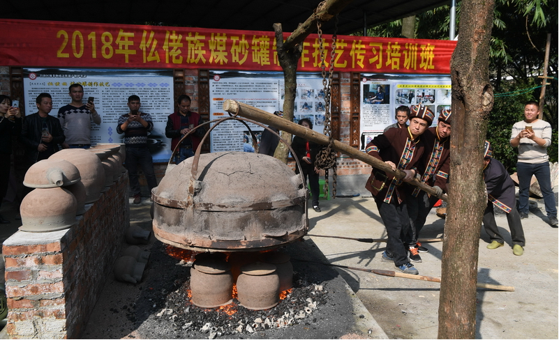 2018年11月26日,罗城仫佬族自治县在四把镇三堆屯举办仫佬族煤砂罐制作技艺传习培训班,煤砂罐技艺传承人吴昌术给学员传授煤砂罐制作全过程技艺,传承仫佬族“非遗”文化。