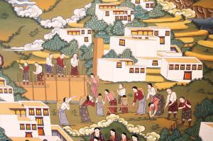 乡城的白色藏房是当地藏族群众在长期的生产生活中创造的独具特色的建筑。这幅唐卡不仅描绘了美丽的白藏房,还记录了别有意味的修筑过程。修筑白色藏房非个体劳动所能完成,一般是村里每家每户都出劳力,男女参加,排成几列,在歌声的伴随下,集体踏着如舞蹈般一致的节拍劳动。