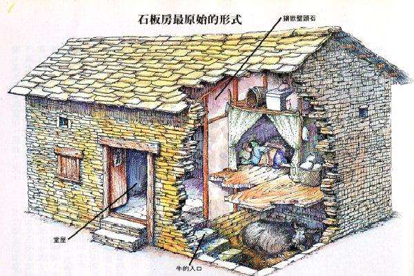 石板房以石条或石块砌墙,墙可垒至5至6米高;以石板盖顶,风雨不透。总之,除檩条、椽子是木料外,其余全是石料,甚至家用的桌、凳、灶、钵都是石头凿的。一切都朴实无华,固若金汤。这种房屋冬暖夏凉,防潮放火,相对采光较差。
