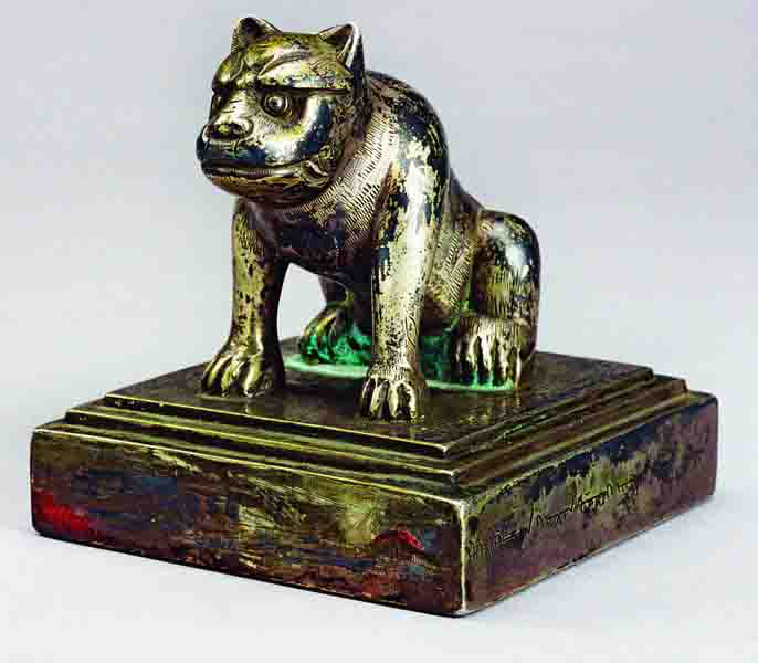 官印是是政权机构、官员的权力凭证,广泛钤用于各种公文,是职官制度的重要组成部分。在不断建立札萨克旗的进程中,清王朝亦颁发札萨克印,这是清王朝对各旗札萨克封授中最重要的权力象征物,是札萨克权力地位合性法的重要标志物。清朝官印早期为满、蒙两种文字,后期为满、蒙、汉三种文字,在制造和管理上有着一套较为完备的制度,对于官印质地、钮式、印形、尺度、称谓、款识等都有严格规定。清代御宝质地以玉为主,银质官印是除御宝外实际印信中的最高品质,主要为一、二品要员用,三品以下皆用铜印;在钮式上,御宝用龙钮,公、侯、伯以及一、二品高级武官及边政大臣的银质官印都用虎钮,其他官员用直钮(后演化为圆柱钮)。翁牛特左翼札萨克印为虎钮银质官印,由此可见其品级。
