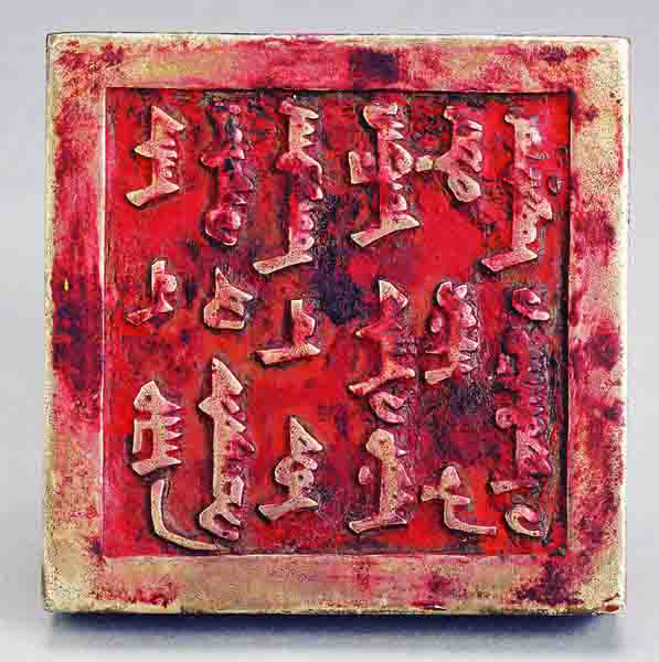现藏于民族文化宫博物馆的这枚清代翁牛特左翼札萨克银印,印面呈正方形,印纽为后坐前立虎,边长10.5厘米,厚2厘米,通高11厘米。印文阳刻满、蒙两种文字,由左向右六行,左三行为蒙文,右三行为满文,汉文译为 “翁牛特左翼札萨克印”。印座侧面以满、蒙两种文字阴刻“康熙二十五年四月”。此印造于清康熙二十五年(1686年),是康熙皇帝颁赐给栋垈青郡王的重孙的官印。