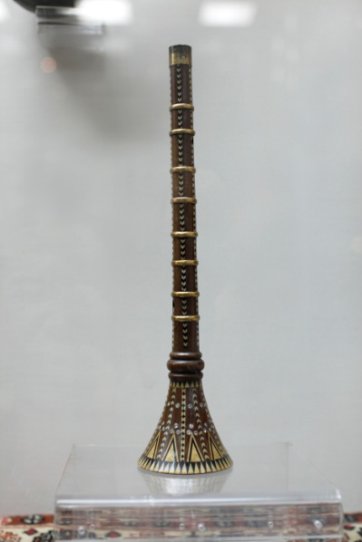 管状的吹奏乐器“苏乃依”,用棘木或桐木挖制而成,形状上细下粗,下端直管,喇叭口形,或套用铜质碗口。管身用骨质花纹和彩色宝石装饰,音孔上插苇质哨片。