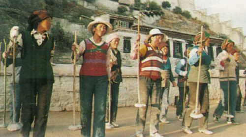 打阿嗄土时,年轻的藏族男女通常是十几个人排成两队,每个人手中拿着一根木制的工具,他们唱着歌、按着一定的节奏前后左右移动步伐,同时用手中的工具敲打着脚下的碎石和泥土。这样的劳动场面像是一种歌舞表演。