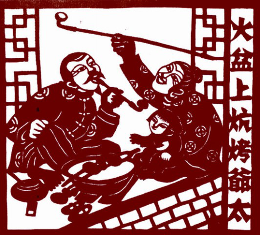满族风情剪纸《火盆上炕烤爷太》