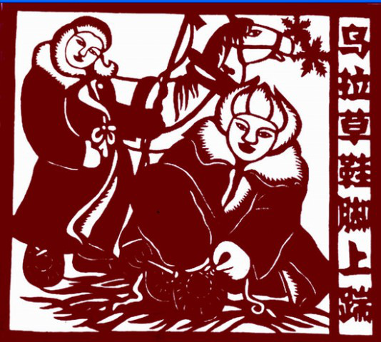 满族风情剪纸《乌拉草鞋脚上踹》
