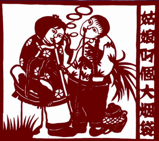 满族风情剪纸《姑娘叼个大烟袋》