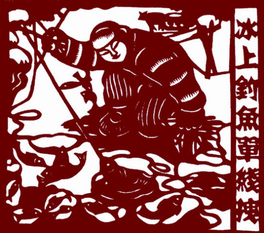 满族风情剪纸《冰上钓鱼单线拽》