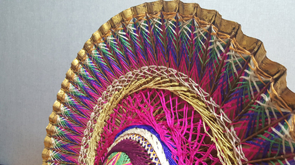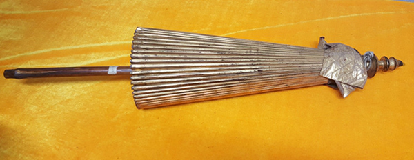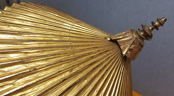 民族文化宫博物馆馆藏烫金百褶布伞,也称金伞,是上个世纪五十年代傣族人民敬献毛泽东主席的礼品。烫金百褶布伞,长90厘米,伞面直径80厘米,为竹、木、布质。从结构上主要分伞柄、伞骨、伞面三部分。其中伞柄、伞骨均为竹质,取材于生长在滇西南的金竹和大龙竹。伞柄由竹竿把和木质伞头两部分组成;长伞骨56根,长短一致、韧性张力良好,竹条支撑而组成的骨架。伞面取材油布,通体刷有金粉。伞内衬为满穿伞,采用绕线和穿花技艺,将红、蓝、白、黄、紫、绿、橘六色线穿、渡交织,编制成网状。整把油布伞采用中国传统的手工制作工艺,伞面金光闪烁,伞内衬色彩艳丽,显得十分高贵典雅。