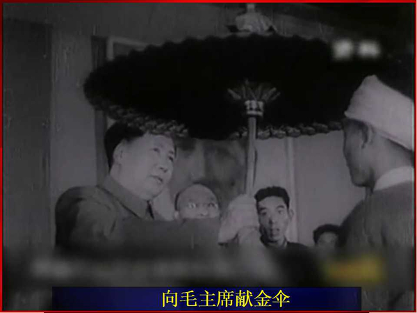 召存信与西双版纳末代宣慰使刀世勋,代表西双版纳各族人民向毛主席敬献金伞(烫金百褶布伞)
