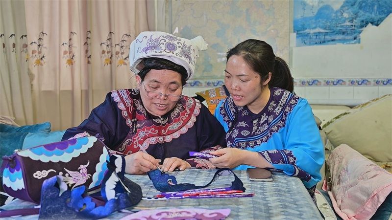 王玉蕊的马尾绣技艺受到很多人青睐,不少人慕名前来,到她家里学习技艺。38岁的蒙菊妹一家四口人刚刚从三合镇永康村搬到县里面凤羽街道城南社区,蒙菊妹一边在饭店务工,一边趁着休息时间来跟王玉蕊学习技艺。