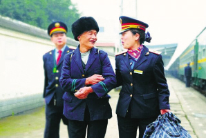 青岛客运段成都车队的乘务人员服务旅客。