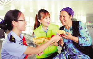 今年春运期间,哈密车务段重点打造“娜依四勤六主动服务法”“古丽重点旅客关爱服务法”等5个民族特色服务品牌,在哈密、柳园等站开展活动,被旅客们亲切地誉为“甜蜜驿站”。哈密车务段广大职工认真履行社会责任,从改善各族旅客出行条件、凝聚各族职工队伍合力等方面入手,加强民族团结,服务新疆经济社会发展。