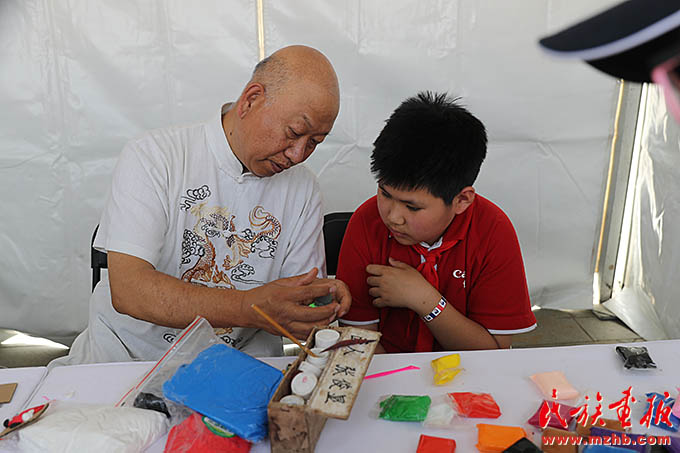 泥人张传承人张俊显专心致志地教小朋友制作泥人