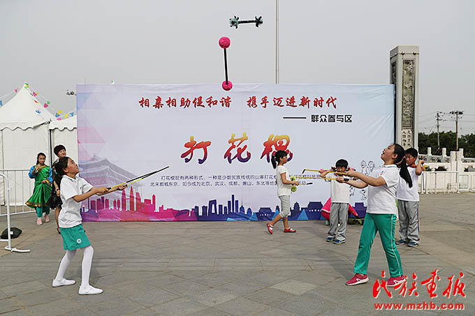 北京市第二十五中学和东城区回民小学师生向群众展示少数民族传统体育项目打花棍