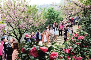 景区内种植茶花6000余亩、380多个名贵品种,每年12月初起到次年5月,幸福紫薇、海角樱花、垂丝海棠、十八学士快活林等景点色彩斑斓,风情万种;牡丹映月、七彩茶梅、鸳鸯凤冠、玉带紫袍等各色花朵飞红落霞,争奇斗艳。