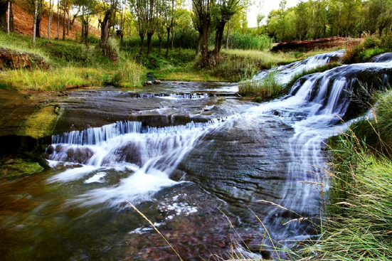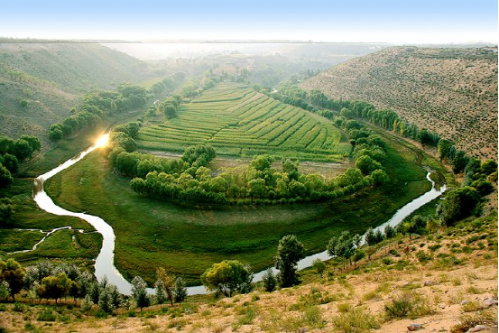 鄂尔多斯沙漠大峡谷因无定河的曲折前行形成了深厚壮观的北方沟川地貌和水回田绕的南方水乡风光,绘就了一幅独特而神奇的自然风情画。每当春暖雪消,桃花盛开。夏秋两季,境内“琵琶岛”上禾苗飞舞,百鸟啾啾;“水帘洞”处流水潺潺,涛声悦耳;“花果山”上蜂飞蝶舞,百果飘香;“美人湖”里鱼儿闹。再加上热情好客民族的相伴,令人仿佛置身桃园仙境,确有回归自然、流连忘返的感觉大沟湾水库和沟底流淌的清澈河水与田园树木、残窑古壁相映成趣,使人如入桃源仙境。在众多景观中,尤以水帘洞最具特色,河水在此处挂起高高的瀑布,猛地跌入一个地下洞穴,在洞内穿行六十多米后,又从另一个洞口跳出了地面。盛夏避暑,游人走入洞里凉爽宜人,别有风味。顺着河往下走,依次是有花果山之称的大沟湾苹果基地、优美的“琵琶岛”和神奇的“水帘洞”。这里是游人常去观赏游玩的地方。据专家考证鄂尔多斯沙漠大峡谷目前在世界上绝无仅有,它所形成的地质地貌及峡谷河流曲折蜿蜒的景观在世界上独一无二。