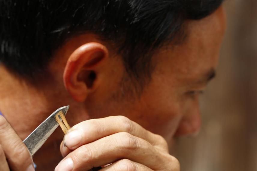 根据所需芦笙型号的大小选择竹料,一般先选好大型号的,再选小型号的,备足相应的竹料进行选择。将选出的笙管用微火进行烫烤,在温度合适了以后,用脚轻轻踩弯曲的部位,使之变直。再用冷水冷却定型,把所有的笙管烫烤定型后,用小刀将其底部削成圆锥状即可。用笙管的底部在升斗的插入部位对比形状。然后用削刀慢慢抠通,笙管与插孔反复进行比对,使插孔与笙管完全吻合。当六根深管全部插入笙斗以后,芦笙的半成品就做好了。芦笙的半成品成型后就开始制作笙声的发音部分。用剪刀将铜皮剪成细条状。在墩子上轻轻地敲打。最后对整片铜皮进行过细。这样就可以割成能发音的簧片了。