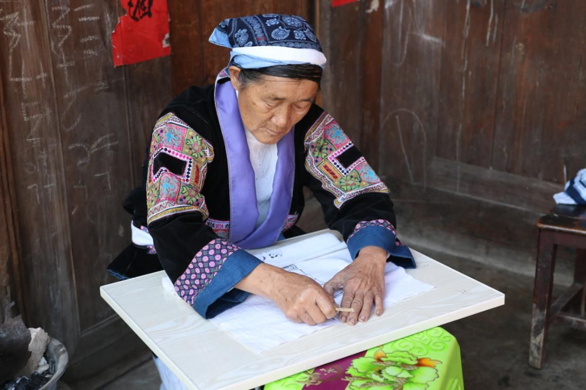 头巾和百褶裙都需要经过蜡染处理,画花刀沾上烧化的黑蜡,在白布上绘制成纹后放入染缸染色,热水清洗脱蜡后蜡染即算完成。而染色水的制作原材更是讲究,是用化香叶、香樟叶、苦丁茶叶、野花椒、野生刺梨干、野花根六种植物一起熬制而成,而浸染过的麻布还得用生豆浆浸泡后才不易脱色。